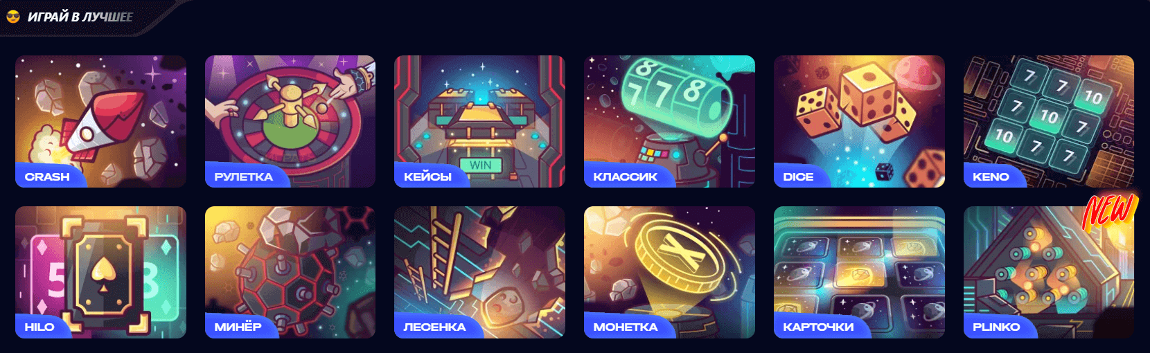 | 🎮 Игры | Классика, рулетка, кейсы, краш, ставки на спорт и киберспорт, кости, кено, хайло, монеты, карты, слоты, майнер, лестница, плинко |